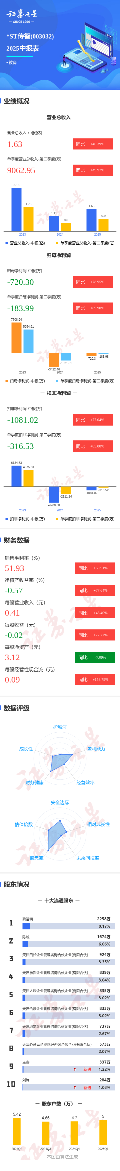 证券之星消息,*ST传智2025年中报显示,公司主营收入1.63亿元,同比上升46.39%;归母净利润-720.3万元,同比上升78.95%;扣非净利润-1081.02万元,同比上升77.05%;其中2025年第二季度,公司单季度主营收入9062.95万元,同比上升49.97%;单季度归母净利润-183.99万元,同比上升89.9%;单季度扣非净利润-316.53万元,同比上升85.01%;负债率26.5%,投资收益193.41万元,财务费用252.28万元,毛利率51.93%。